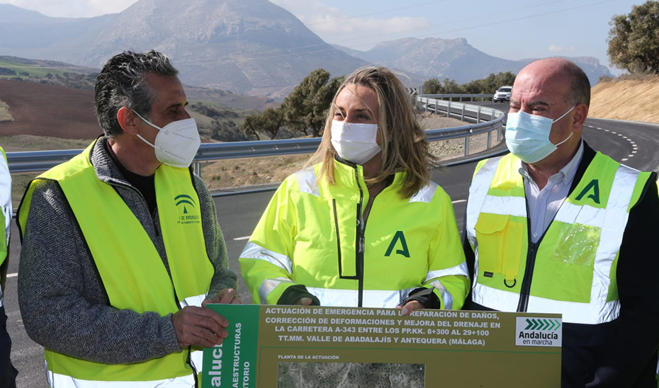 La Consejería de Fomento, Infraestructuras y Ordenación del Territorio ha finalizado las obras de reparación de los graves daños sufridos en la carretera A-343 con motivo de las últimas lluvias. Marifrán Carazo ha comprobado, junto a los alcaldes de Antequera, Manuel Barón, y de Valle de Abdalajís, José Romero, el resultado de unos trabajos realizados por 1,7 millones de euros sobre más de 20 kilómetros de esta vía, que conecta las comarcas de Antequera y Guadalhorce por el Valle de Abdalajís.