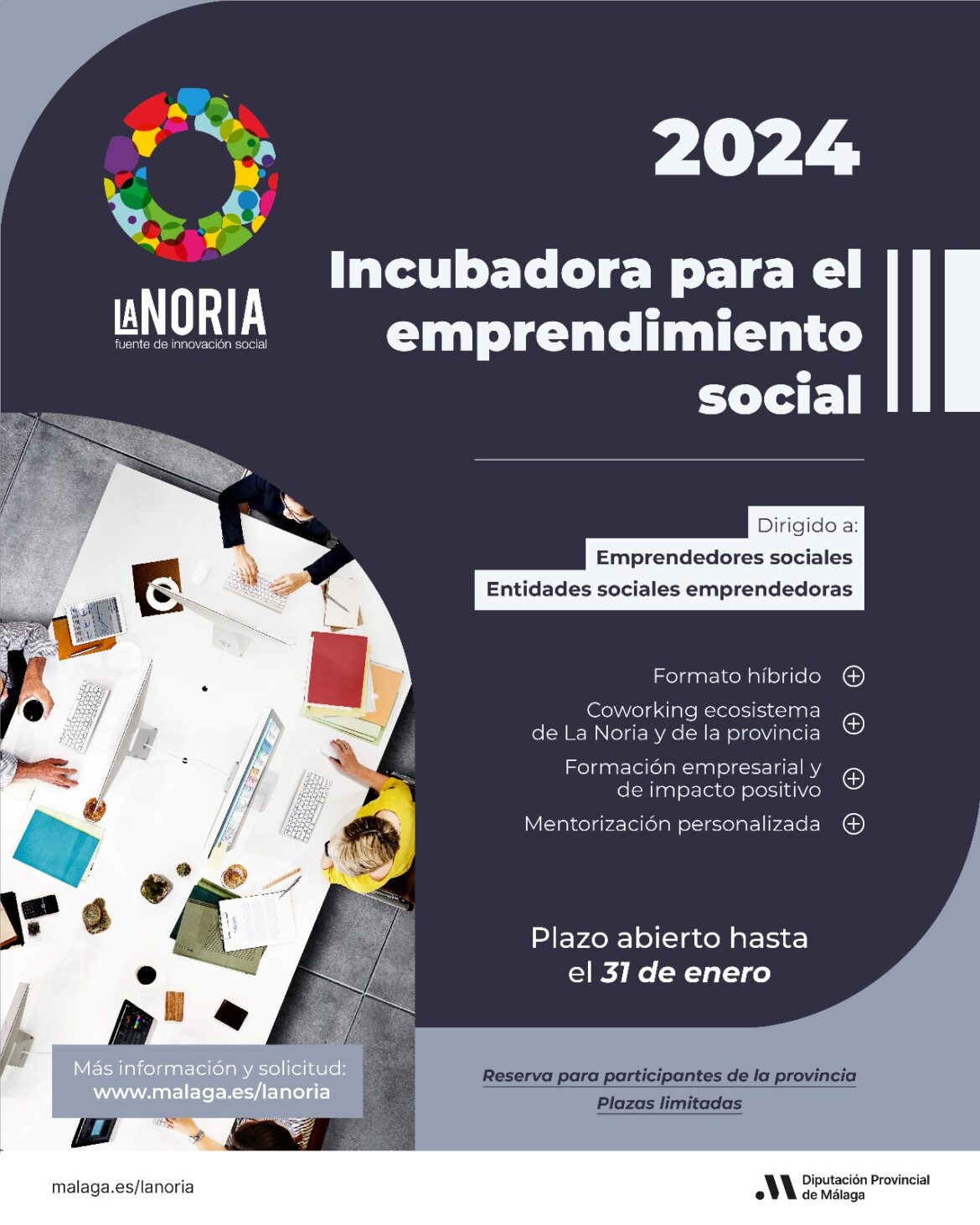 El centro de innovación social La Noria de la Diputación de Málaga abre una nueva convocatoria de la Incubadora de Emprendimiento Social. Un total de 20 ideas de negocio o iniciativas emprendedoras se beneficiarán de un programa especializado y se convertirán en proyectos de emprendimiento social y proyectos empresariales sostenibles económicamente que satisfagan necesidades sociales.