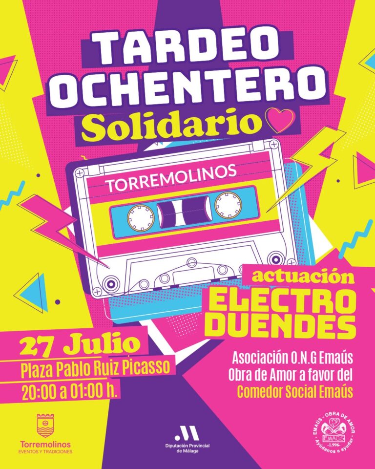 La verbena tendrá lugar el próximo 27 de julio en la plaza Pablo Ruiz Picasso, en horario de 20:00 a 01:00 horas. Los asistentes podrán disfrutar durante la velada del grupo ‘Electroduendes’, la banda especializada en versionar temas pop-rock de los años 80. También se subirá al escenario la cantante Mandy Mezzo, que interpretará temas esperanzadores, que inspiran a luchar por los sueños. Estará presentado por el cantante y vecino de Torremolinos Sergio XL. La plaza contará con una barra donde se servirá comida y bebida a precios populares y cuya recaudación irá destinada al comedor social Emaús.