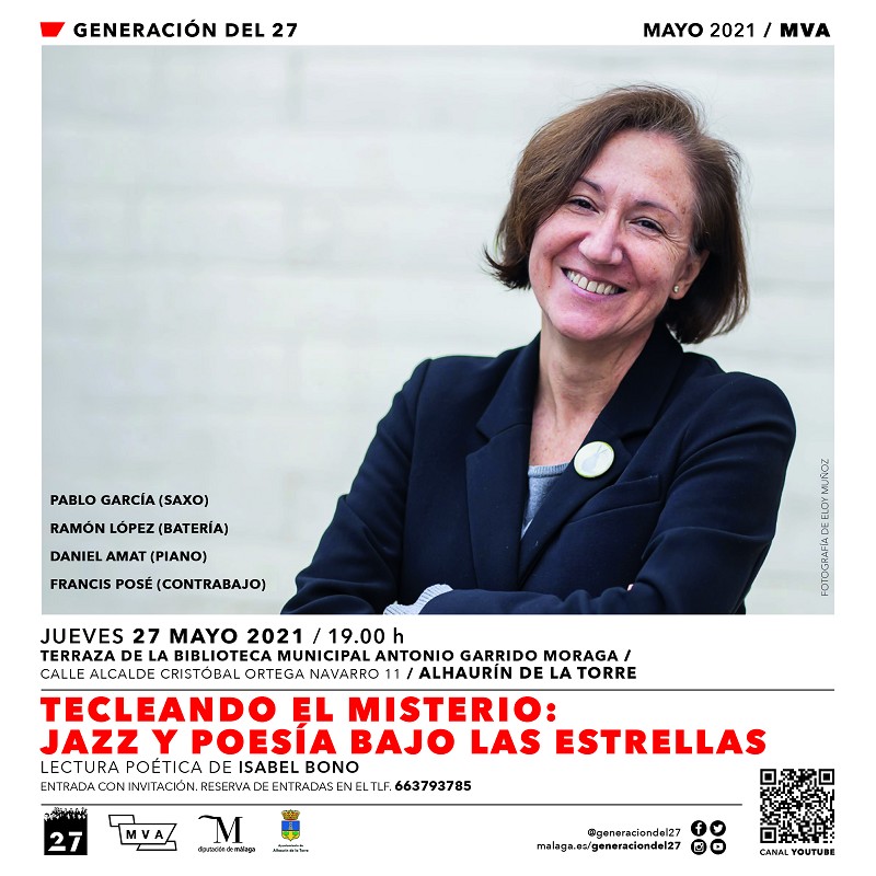 Mañana jueves, 27 de mayo, continúa ‘Tecleando el misterio. Jazz y poesía bajo las estrellas’, el ciclo poético musical que organiza el Centro del 27 de la Diputación de Málaga y en el que las notas improvisadas de una banda de jazz se intercalan con los versos de un poeta. En esta ocasión, la invitada será la poeta malagueña Isabel Bono, y el escenario será una vez más terraza de la biblioteca pública Antonio Garrido Moraga de Alhaurín de la Torre, donde la autora estará acompañada por la banda de jazz formada por Daniel Amat al piano, Francis Posé en el contrabajo, Ramón López a la batería y Pablo David García en el saxo alto.