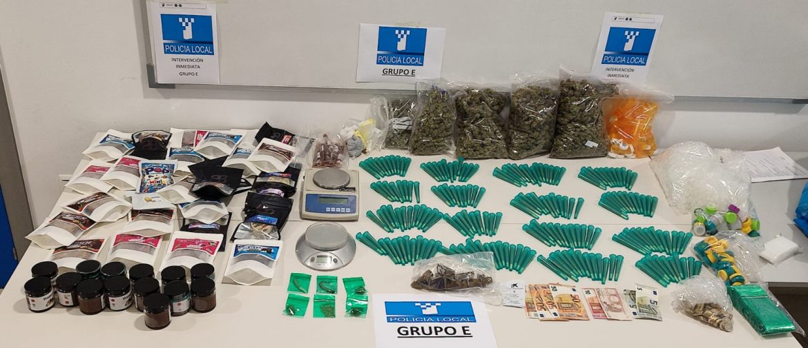 La actuación policial requisó 185 gramos de hachís, 184 cigarros, once zumos y 29 dulces de marihuana, balanzas de pesaje y más de 200 euros en efectivo