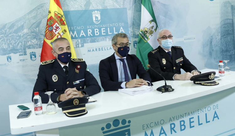 Una media de cien agentes diarios de la Policía Local de Marbella, reforzados por otros 164 efectivos en servicios puntuales, velarán hasta el próximo 5 de enero por la seguridad de los ciudadanos, en el marco del dispositivo especial puesto en marcha desde por el Ayuntamiento desde el pasado 25 de noviembre de cara a estas fiestas. El concejal del ramo, José Eduardo Díaz, ha destacado hoy durante la presentación del operativo la “labor conjunta y coordinada” que el cuerpo municipal realiza junto a la Policía Nacional, que en este caso redistribuirá a los 209 funcionarios que componen la plantilla de la Comisaría para dar respuesta a las necesidades del ‘Plan Comercio Seguro’, según ha concretado el comisario de la localidad, Enrique Lamelas. El edil ha destacado la importancia de este dispositivo “en unas fechas de alta concentración de eventos y de personas” y ha hecho un llamamiento “a la prudencia y a continuar con el cumplimiento de las normas sanitarias frente al Covid-19”.El jefe de la Policía Local, Javier Martín, por su parte, ha señalado que “nuestro objetivo dentro de este operativo especial va enfocado a cubrir los servicios precisos para atender los 74 eventos que se van a desarrollar en el municipio en torno a la Navidad, atendiendo al mismo tiempo las necesidades del servicio diario”. Para ello, ha indicado que “contamos con agentes uniformados y de paisano para dar cumplimiento a nuestras competencias en materia de tráfico, ordenanza y seguridad ciudadana” y ha resaltado que “este año aumentará el servicio en cien horas más con respecto al pasado 2020”. Martín ha especificado que en materia de prevención “se realizarán controles preventivos a cualquier hora sobre el consumo de alcohol y drogas en la vía pública y, en lo que se refiere al tráfico, intensificaremos el trabajo en los lugares de concentración de personas, centros comerciales, cascos antiguos y zonas de carga y descarga”. Ha añadido, además, que “la policía administrativa reforzará el horario de apertura y cierre de establecimientos, los aforos, los horarios y controles de botellones y de depósito de residuos fuera del horario establecido”. Por último, Lamelas ha explicado que el ‘Plan Comercio Seguro’ en el que trabaja Policía Nacional “se aprobó en 2013 y adquirió carácter permanente en 2017”, retomándose este año tras la pandemia. “El fin es procurar que no se incrementen las infracciones penales tanto en los comercios como en los ciudadanos que acuden a los mismos”, ha apuntado. El operativo policial contempla la difusión del plan para fomentar la colaboración ciudadana y concienciar a los consumidores y comercios de la necesidad de crear un entorno de seguridad, así como la implantación propiamente dicha del dispositivo. “Este plan de comercio se realiza con dos fases, la previa, que tuvo lugar del 26 de noviembre al 6 de diciembre, donde los funcionarios de la Brigada de Participación Ciudadana han incrementado los contactos con las asociaciones de comerciantes para darles consejos preventivos de seguridad y la operativa, hasta el 9 de enero”, ha indicado. El comisario ha detallado que “los servicios se realizarán diariamente en las zonas de mayor actividad y afluencia de público” y participarán en el dispositivo las brigadas de Seguridad Ciudadana y de Policía Judicial, en este último caso compuesta por agentes no uniformados.