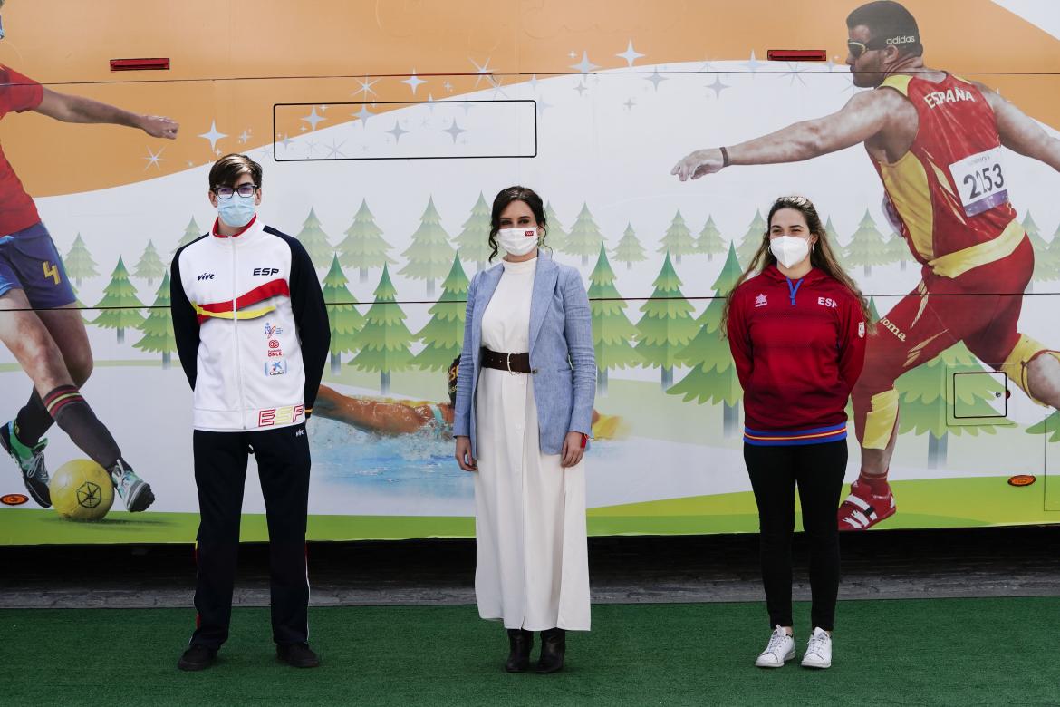 La presidenta de la Comunidad de Madrid, Isabel Díaz Ayuso, ha recibido hoy en la Puerta del Sol al autobús conmemorativo del Comité Paralímpico Español que, con motivo de la celebración de su 25 aniversario, está recorriendo la región para recordar los importantes logros deportivos alcanzados en estos años en favor de la normalización, la visibilización y la igualdad de oportunidades de las personas con discapacidad en la sociedad.