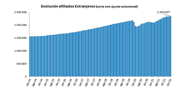 La Seguridad Social registró 2.343.637 afiliados extranjeros en abril, una vez descontada la estacionalidad y el efecto calendario. Son 1.633 trabajadores más que el mes anterior y 154.216 más que en febrero de 2020, antes del impacto de la pandemia