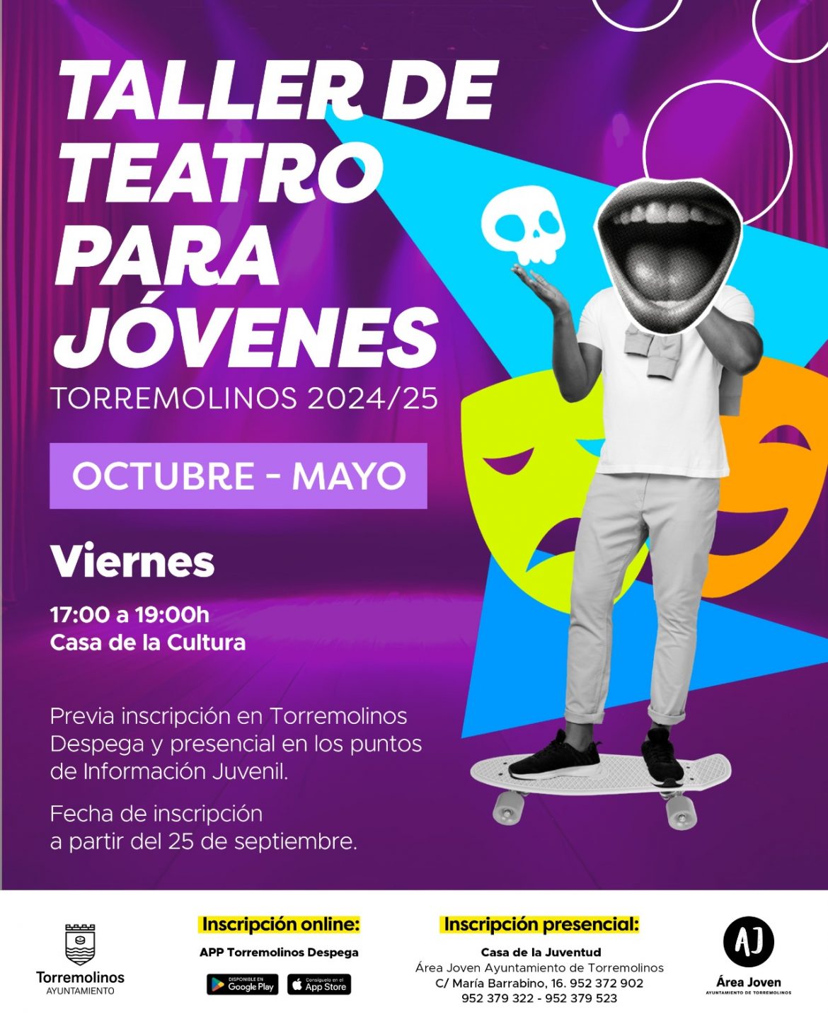 El curso-taller de teatro para jóvenes dará comienzo el viernes 4 de octubre y los interesados podrán disfrutar de dos horas semanales de formación actoral en las instalaciones de la Casa de la Cultura, todos los viernes en horario de 18:00h a 20:00h.