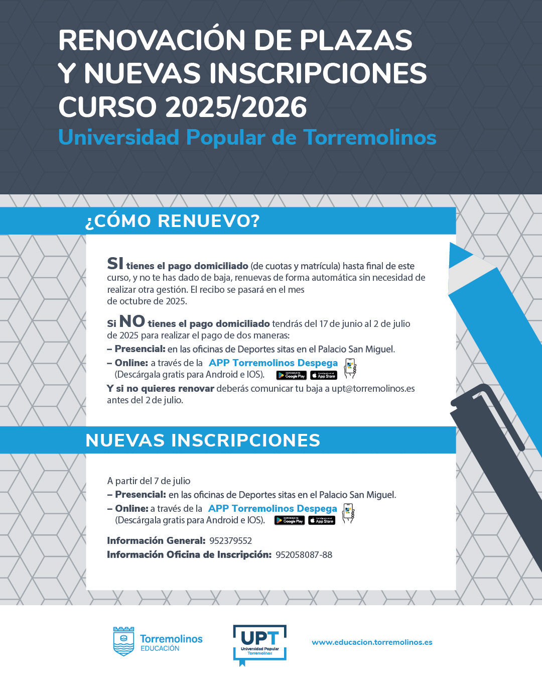 El próximo lunes 7 de julio se abre el plazo para nuevas inscripciones en la Universidad Popular de Torremolinos (UPT), y el 14 de julio para quienes quieran iniciarse en la Escuela Municipal de Música (EMM). Los plazos estarán abiertos hasta que se agoten las plazas vacantes.