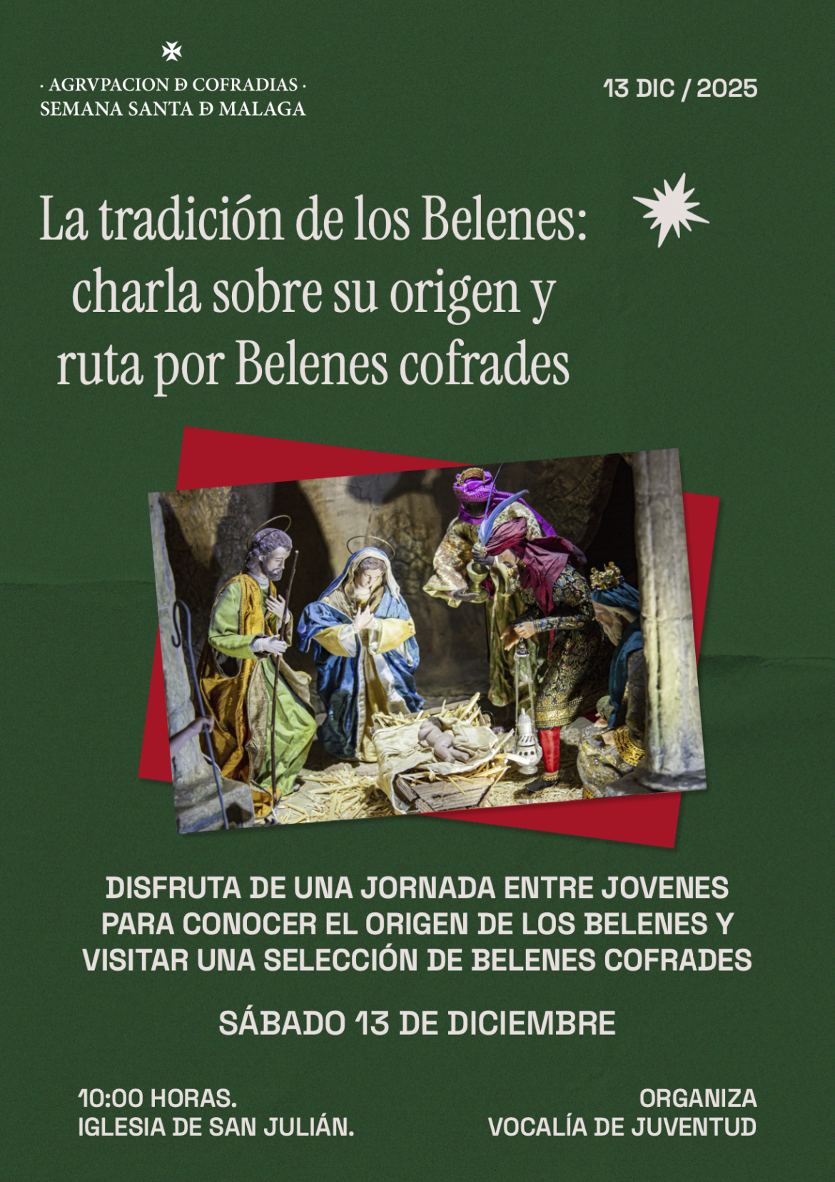 La Vocalía de Juventud de la Agrupación de Cofradías de Semana Santa de Málaga ha organizado para el próximo sábado 13 de diciembre la actividad titulada “La tradición de los belenes: charla sobre su origen y ruta por belenes cofrades”, una propuesta formativa y cultural destinada a acercar a los jóvenes cofrades, y a todos los interesados, a una de las costumbres más arraigadas de la Navidad.