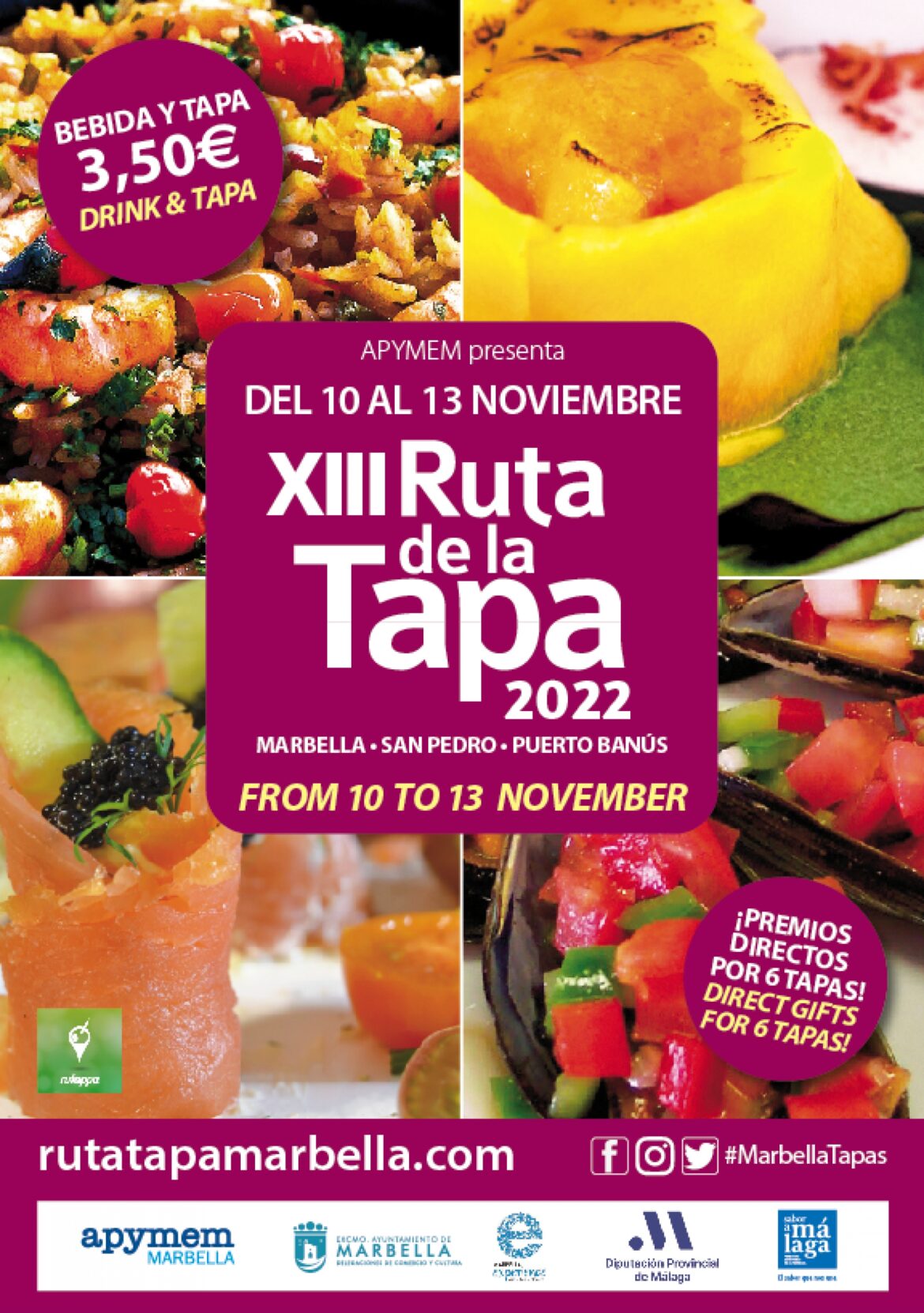La XIII Ruta de la Tapa de Marbella, San Pedro y Puerto Banús se celebrará del 10 al 13 de noviembre y contará con la participación de más de una treintena de establecimientos. El responsable de la Oficina del Casco Antiguo, Baldomero León, ha presentado hoy el evento junto al presidente de la Asociación de la Pequeña y Mediana Empresa de Marbella (Apymem), Enrique Guerrero, y ha subrayado el apoyo del Ayuntamiento “a una iniciativa plenamente consolidada en la agenda del municipio que tiene como principal objetivo dinamizar el sector comercial aunando gastronomía y ocio”, al tiempo que ha resaltado “la magnífica labor de reactivación que impulsa la entidad organizadora”.