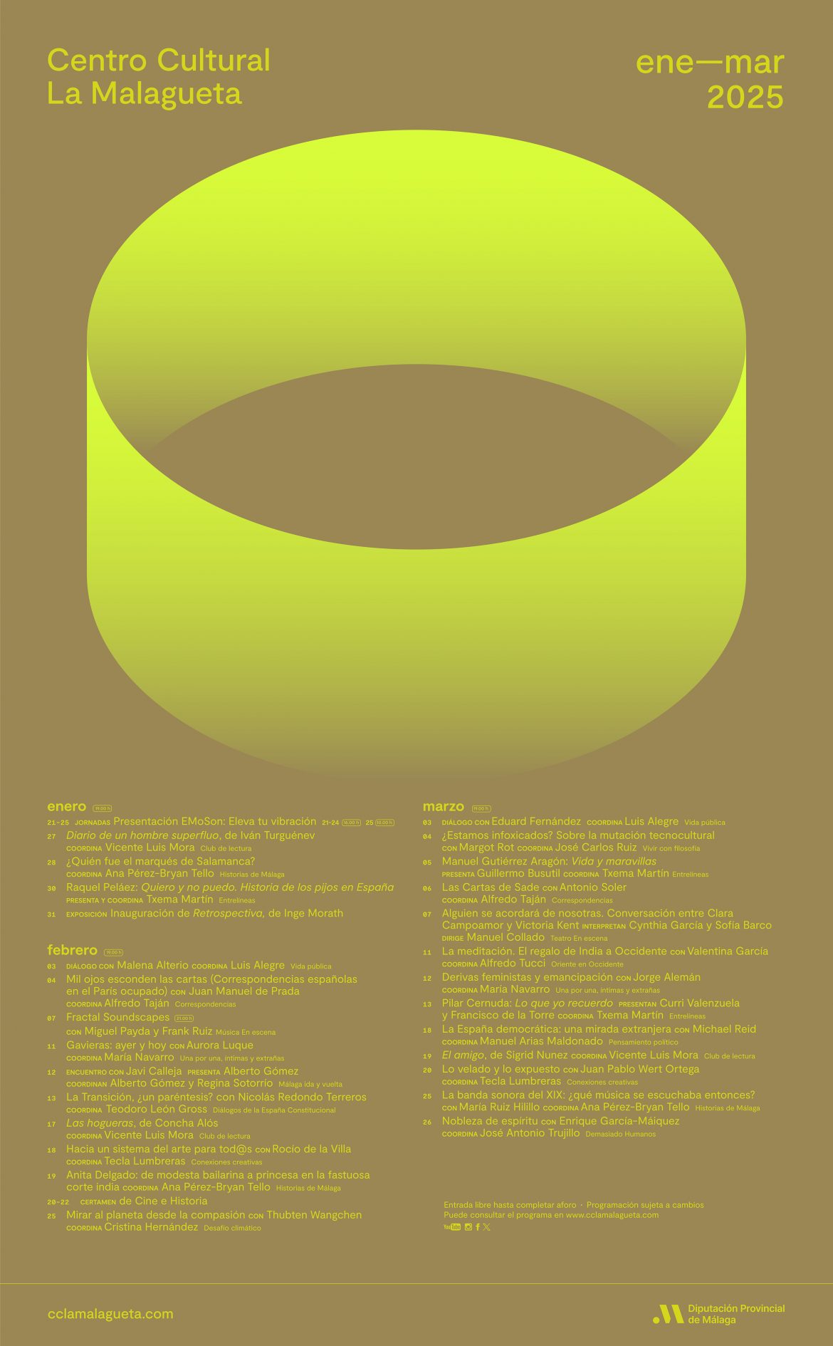 El Centro Cultural La Malagueta de la Diputación de Málaga ha presentado su programación del primer trimestre de 2025, con especial atención a las artes escénicas y plásticas, música en directo, formación y nuevos ciclos, como novedades, gracias a la renovación de sus instalaciones. “El Centro quiere así ahondar en la difusión de la cultura para ir más allá de su habitual programación de conferencias y ofrecer al público nuevos formatos”, ha anunciado el vicepresidente de Cultura, Manuel López Mestanza. Asimismo, habrá una veintena de encuentros con personalidades del mundo del cine, literatura, arte, política, filosofía y comunicación.