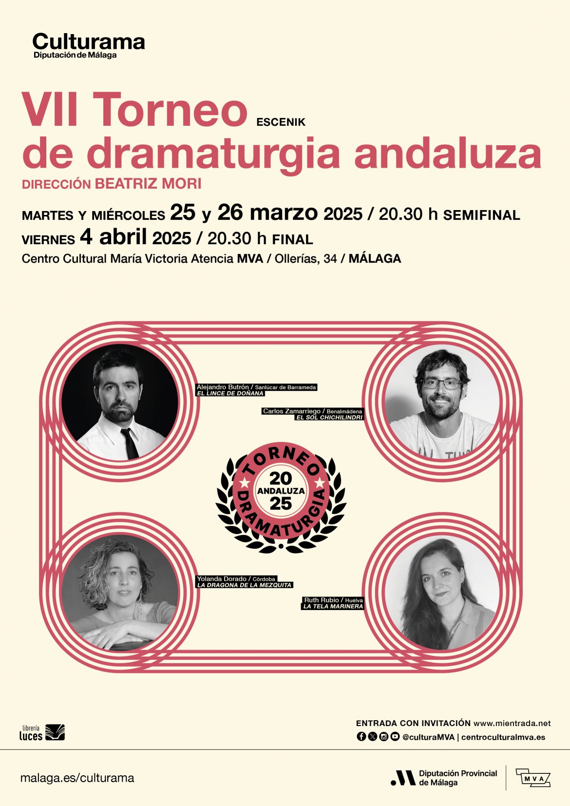 El auditorio del centro cultural María Victoria Atencia celebrará un año más las dos semifinales y la final del Torneo de Dramaturgia Andaluza. Dentro de un ring de boxeo, a lo largo de dos semifinales y una final, se enfrentan cuatro textos dramáticos de treinta minutos de duración. Estas cuatro obras compiten como lecturas dramatizadas y son defendidas por doce intérpretes malagueños (dos lecturas y cuatro intérpretes por día de competición). Solamente el público es quien decide qué texto pasa en cada eliminación y quién se lleva el premio final. Las dos semifinales serán el martes 25 y el miércoles 26 de marzo en el MVA a las 20:30 horas. Las invitaciones estarán disponibles desde el 24 de marzo en mientrada.net.