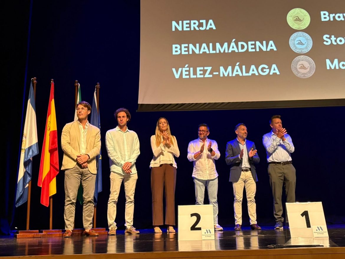 El martes se celebró en el auditorio Edgar Neville de la Diputación la gala de clausura de los circuitos, presidida por el vicepresidente y diputado de Deportes, Juan Rosas, a quien acompañan delegada de la Federación Andaluza de Natación en Málaga, Sara Fernández Moreno, y representantes municipales de los ayuntamientos participantes.