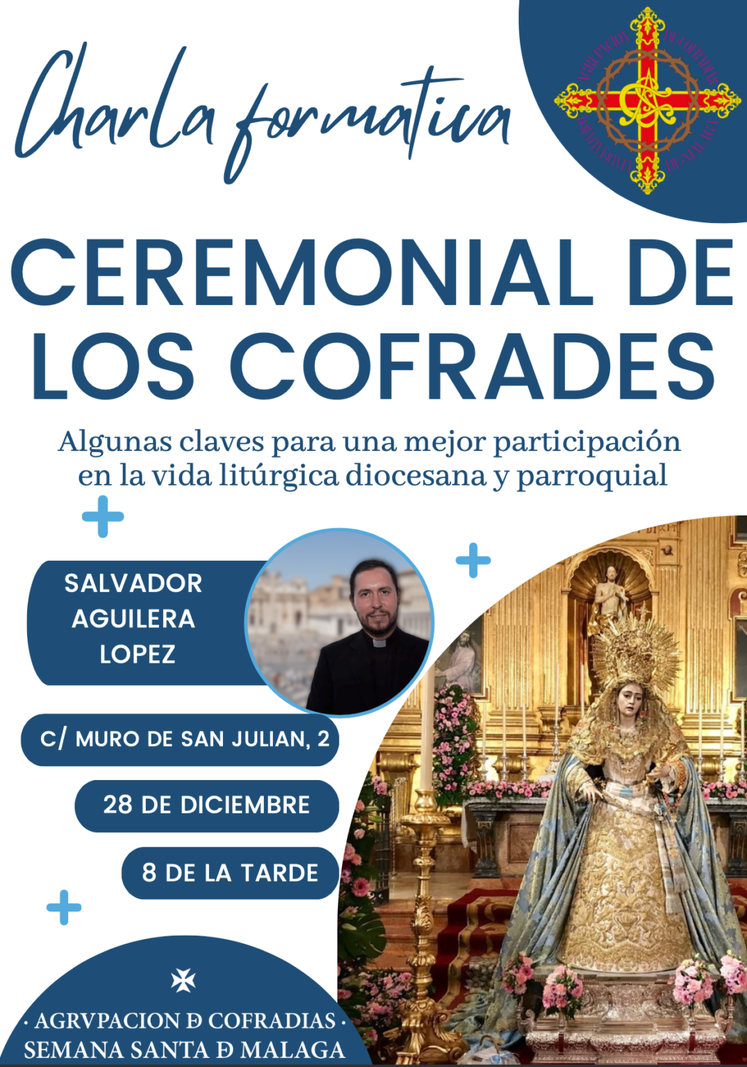 Bajo el título de “Ceremonial de los cofrades”, la sala capitular de la Agrupación de Cofradías de Semana Santa de Málaga acogerá el próximo 28 de diciembre a las 20:00 horas una charla impartida por el sacerdote Salvador Aguilera López.