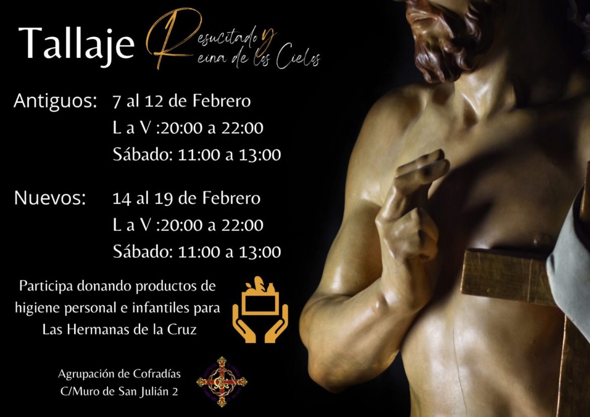 Los portadores nuevos que deseen llevar el trono del Santísimo Cristo Resucitado y María Santísima Reina de los Cielos el próximo Domingo de Resurrección, así como los nazarenos nuevos que quieran formar parte del cortejo, deberán tallarse del 14 al 19 de febrero, de lunes a viernes, de 20:00 a 22:00 horas, y el sábado, de 11:00 a 13:00 horas.