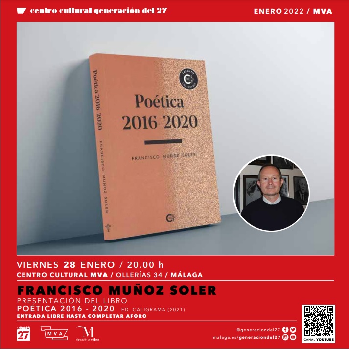 El Centro Cultural Generación del 27 continúa desarrollando su labor editorial y de apoyo a los escritores malagueños. Este viernes, 28 de diciembre, el salón de actos del Centro Cultural MVA será el escenario de la presentación de la última novedad literaria del malagueño Francisco Muñoz Soler: ‘Poética 2016-2020’, que agrupa varios de sus poemarios.