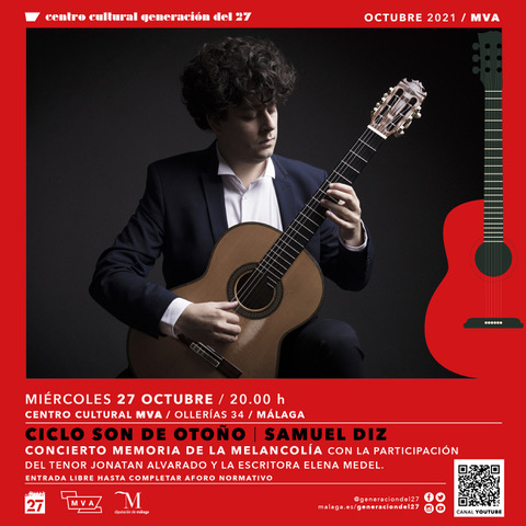El ciclo musical Son de Otoño que organiza el Centro Generación del 27 de la Diputación regresa hoy miércoles al Centro Cultural MVA (C/ Ollerías, 34) con el concierto de guitarra de Samuel Diz, que presentará su último trabajo discográfico, ‘Memoria de la melancolía’, un recorrido musical por la vida y obra de la escritora María Teresa Léon (1903-1988), autora  cuyo legado documental, reunido por sus hijos Gonzalo Sebastián y Aitana Alberti, se conserva en el propio Centro Cultural Generación del 27 de la Diputación.