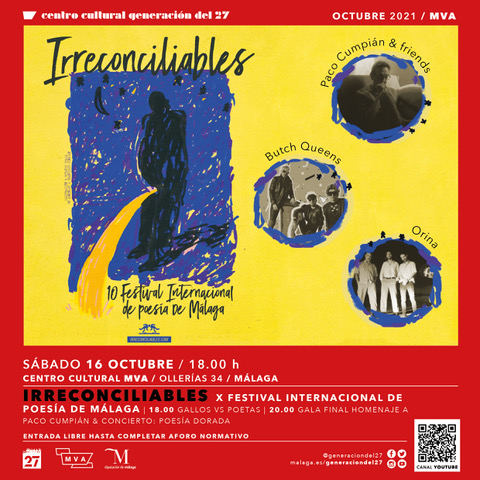El diputado de Cultura, Víctor González, ha recordado que, desde sus comienzos hasta la fecha, el Centro del 27 de la Diputación ha patrocinado este certamen cuyo objetivo fundamental es mostrar los diferentes lenguajes poéticos y las propuestas más actuales. Desde hace algunos años se ha convertido en una tradición que los actos de clausura de Irreconciliables se celebren en el MVA, y así vuelve a ser este año con un evento final que tendrá lugar mañana sábado, 16 de octubre, y que será de entrada libre hasta completar el aforo de la sala.