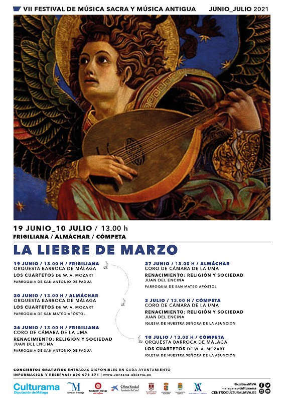 El Festival de Música Sacra y Música Antigua ‘La liebre de marzo’, que se celebra en Frigiliana desde el año 2014, crece en su séptima edición y sale por primera vez de su municipio de origen para recorrer también Almáchar y Cómpeta de la mano de la Diputación con un programa de seis conciertos gratuitos del 19 de junio al 10 de julio.