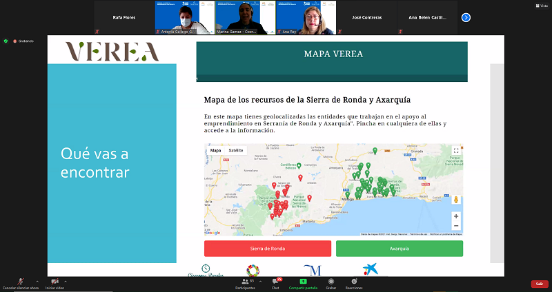 Cicerones Rurales ha sido la encargada de presentar el mapa que ha realizado de los recursos y oportunidades para el emprendimiento que existen en la Axarquía y en la Serranía de Ronda. Este mapa, disponible online para su consulta (https://ciceronesrurales.com/mapa-verea/), ofrece información georeferenciada de los recursos y entidades que trabajan por el emprendimiento en sendas comarcas.