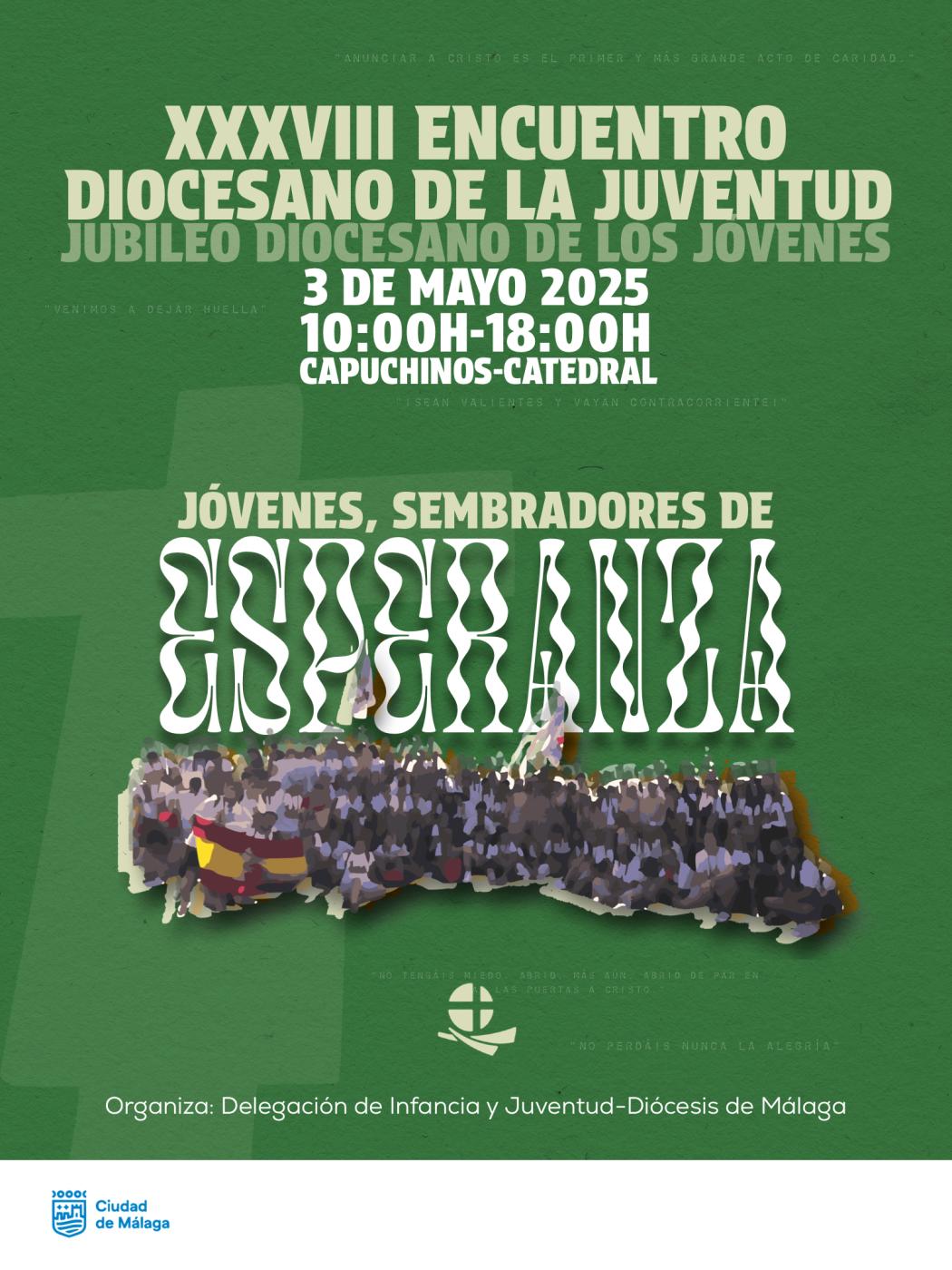 En esta ocasión, se celebra la edición número 38, que también será el Jubileo Diocesano de los Jóvenes: «Una ocasión propicia para que los jóvenes de nuestras realidades parroquiales, movimientos, asociaciones, congregaciones, colegios y hermandades compartan su fe y den testimonio de Jesucristo por nuestras calles», afirma el delegado de Juventud, José Miguel Porras. De hecho, el lema será “Jóvenes, sembradores de esperanza”, haciendo un guiño al Año Jubilar.