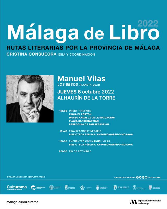 La primera cita tendrá lugar el 6 de octubre en Alhaurín de la Torre gracias a la participación de Manuel Vilas, novelista encargado de convertir parte del patrimonio de esta localidad en elementos fundamentales sobre los que se soporta su último trabajo, ‘Los besos’. Así, a las 18:00 horas, la Finca Municipal El Portón será el escenario de salida del itinerario basado en la novela y guiado por el propio escritor. Acompañada por la coordinadora de Málaga de Libro, Cristina Consuegra, Vilas dará vida a esta novela desde una nueva óptica que une la singularidad patrimonial y la singularidad literaria.