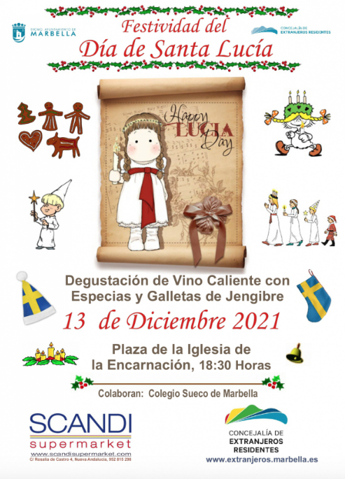 Marbella celebrará el próximo lunes, día 13 de diciembre, el ‘Día de Santa Lucía’, organizado por la concejalía de Extranjeros Residentes. El acto comenzará a las 18.30 horas en la Plaza de Nuestra Señora de la Encarnación y contará nuevamente con la participación de los escolares del Colegio Sueco con sus túnicas blancas, sus velas y sus cánticos de Navidad para conmemorar esta festividad tan especial para la comunidad nórdica. Todo ello, aderezado con las típicas galletas suecas hechas con jengibre, canela o cardamono, acompañadas de chocolate y vino caliente (glögg) que la delegación municipal ofrece a los asistentes.