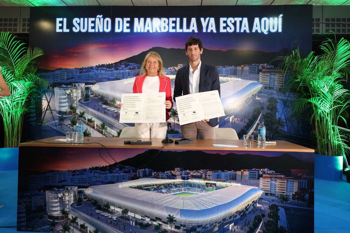 Marbella ha dado luz verde a la construcción de su nuevo estadio, un equipamiento de vanguardia con capacidad para 10.000 espectadores que se convertirá en un referente deportivo y de ocio y se levantará sobre la parcela de 45.000 metros cuadrados del antiguo Antonio Lorenzo Cuevas. El Ayuntamiento y la Fundación Marbella FC han firmado hoy, en un multitudinario acto que ha tenido lugar en el Palacio de Congresos, la concesión demanial para la ejecución y explotación del recinto por una duración de 75 años, un acuerdo que contempla una inversión total por parte de la entidad de más de 114 millones de euros. La alcaldesa, Ángeles Muñoz, que ha rubricado el documento junto al representante del Marbella FC, Esteban Granero, ha señalado que es “un día histórico” y ha subrayado que «marcará un antes y un después en una ciudad que apostó de manera rotunda por tener una gran infraestructura deportiva».