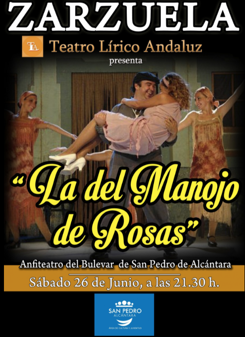 La Tenencia de Alcaldía de San Pedro Alcántara, a través del Área de Cultura, informa que el próximo sábado, 26 de junio, a las 21.30 horas, en el anfiteatro del Bulevar tendrá lugar el sainete lírico ‘La del manojo de rosas’, zarzuela del maestro Pablo Sorozábal, a cargo de la compañía Teatro Lírico Ándaluz y recomendado para todos los públicos. La entrada es gratuita hasta completar el aforo, reducido a causa del Covid-19. Igualmente, se tendrán en cuenta todas las recomendaciones y normativa higiénicos-sanitarias de prevención frente a la pandemia.