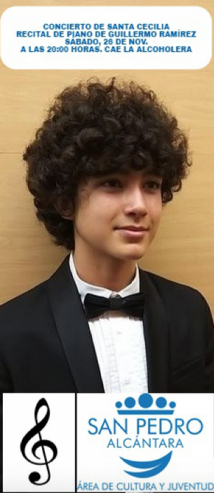 El Centro de Artes Escénicas La Alcoholera de San Pedro Alcántara celebrará el próximo 27 de noviembre, a las 20.00 horas, el tradicional concierto en honor a la patrona de la música, Santa Cecilia, una cita que contará con la actuación del pianista local Guillermo Ramírez. “Desde el Área de Cultura queremos apoyar a jóvenes de nuestra localidad que destacan por su talento a través de eventos como el que hemos organizado para este sábado”, ha destacado el director general sampedreño de Cultura, José Antonio Moreno.