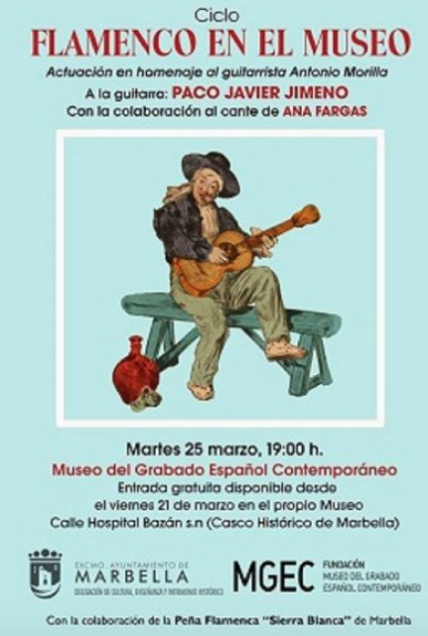 El Museo del Grabado Español Contemporáneo albergará el próximo martes día 25, a las 19.00 horas, un homenaje al guitarrista marbellí Antonio Morilla con el que arrancará el nuevo ciclo de recitales ‘Flamenco en el museo’, que se desarrollará los últimos martes de marzo, abril y mayo y en el que este instrumento será el protagonista. El concierto contará con al artista procedente de Estepona Paco Javier Jimeno, uno de los más galardonados en la actualidad, y la colaboración de la cantaora Ana Fargas, nacida en el municipio.