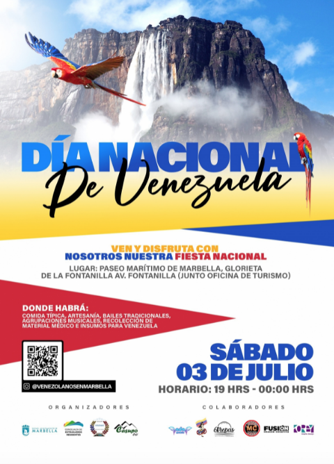 La Glorieta de La Fontanilla (junto a la Oficina de Turismo) acogerá el próximo 3 de julio, desde las 19.00 hasta las 00.00 horas, la celebración del Día Nacional de Venezuela. El evento, organizado por la delegación de Residentes Extranjeros junto a la Asociación de venezolanos VENEMAR, contará con un amplio programa de actividades, que incluirá puestos de artesanía, comida típica, actuación de agrupaciones musicales y bailes tradicionales. Igualmente, el colectivo recogerá material médico, entre otros artículos, con el objetivo de enviarlos al país sudamericano. Según los últimos datos del padrón municipal, en Marbella hay actualmente 719 ciudadanos venezolanos censados. Para más información, los interesados pueden visitar las redes sociales de VENEMAR.