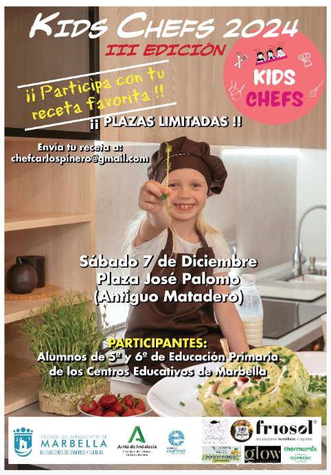 La plaza José Palomo de Marbella albergará este sábado, 7 de diciembre, la iniciativa ‘Kids Chefs, experiencia gastronómica para niños’, una actividad organizada por la delegación municipal de Comercio. El evento, que se desarrollará en la sede de la Cofradía de la Pollinica, está subvencionado por el Plan Turístico de Grandes Ciudades de Andalucía y va dirigido a alumnos de 5º y 6º de Primaria de los centros educativos del municipio. Los interesados en registrarse pueden reservar su plaza enviando una receta al correo electrónico chefcarlospinero@gmail.com. Además, la concejalía ha remitido toda la información a los colegios, con el objetivo de acercar a los escolares el mundo de la gastronomía, uno de los principales atractivos turísticos de la ciudad.