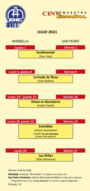 El Ayuntamiento, a través de la delegación de Cultura y Enseñanza, ha programado para el mes de julio una nueva edición de la muestra de Cine Español, en la que se proyectarán seis títulos, cinco largometrajes y un cortometraje tanto en Marbella como en San Pedro, considerados referentes del séptimo arte en el presente año y respaldados por la crítica y el público. La programación comenzará el 1 de julio en Marbella y el 2 en San Pedro, con la película ‘Sentimental’, de Cesc Gay, y se extenderá hasta el 27 de julio, con funciones en un único pase a las 20 horas tanto en la sala de proyecciones del instituto Río Verde en Marbella como en el Centro Municipal de Música, en la plaza de la Libertad de San Pedro. El precio de las entradas es de 3 euros.