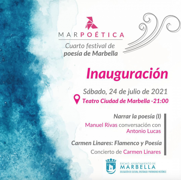 El Ayuntamiento de Marbella informa de que la actividad literaria del IV Festival Marpoética, que impulsa la delegación de Cultura, arrancará mañana sábado, 24 de julio, con la presencia del escritor gallego Manuel Rivas, uno de los narradores más leídos de la literatura española contemporánea, y de la cantaora jiennense Carmen Linares, máxima figura del flamenco actual. Ambos serán los protagonistas de una noche inaugural que comenzará a partir de las 21.00 horas en el Teatro Ciudad de Marbella y que significará el pistoletazo de salida a una intensa semana de actividades, en la que se incluyen algunos de los principales nombres de la poesía española.