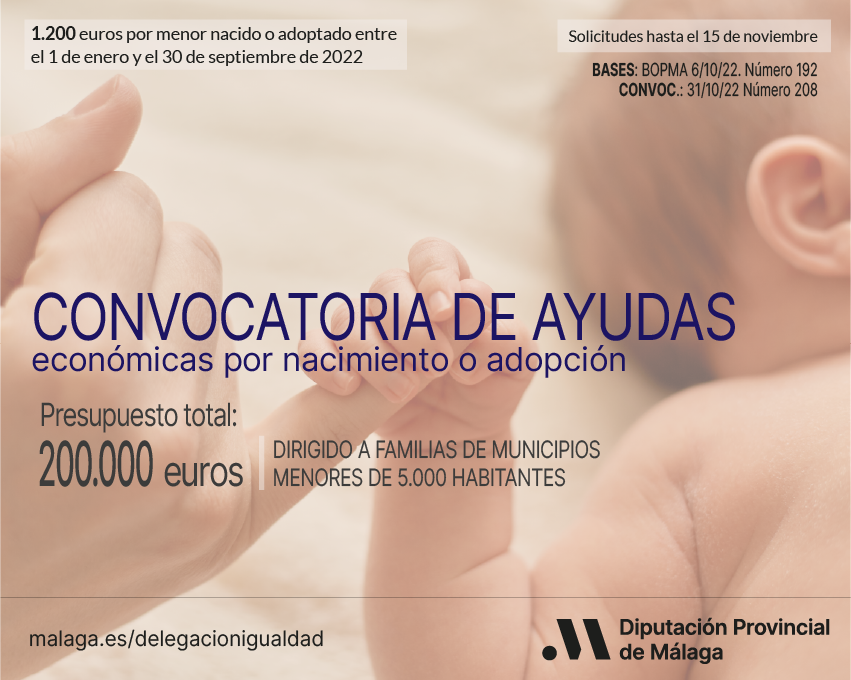 La Diputación de Málaga abrió el 1 de noviembre, el plazo de una segunda convocatoria de ayudas por nacimiento o adopción para familias que residan en los municipios menores de 5.000 habitantes, conocido como el ‘cheque bebé’. Esta línea de subvenciones, cuya convocatoria se publica hoy, 31 de octubre, en el Boletín Oficial de la Provincia de Málaga número 208, está dotada con 200.000 euros y podrán beneficiarse unas 166 familias de esas localidades. La cuantía máxima que se concederá será de 1.200 euros por menor nacido o adoptado entre el 1 de enero de 2022 y el 30 de septiembre de 2022, ambos inclusive.