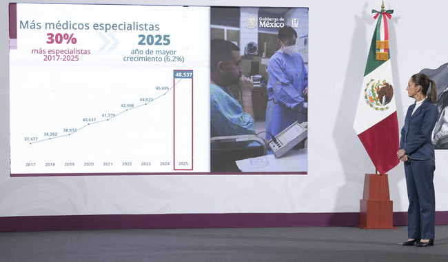 La Presidenta de México, Claudia Sheinbaum Pardo, resaltó que en 2025 se rompió récord en formación y contratación de médicos especialistas del Instituto Mexicano del Seguro Social (IMSS) con el objetivo de mejorar la atención médica, en contraparte al periodo neoliberal, en el que se cerró el ingreso a las especialidades médicas con la creencia de que así se formarían “médicos de excelencia”.