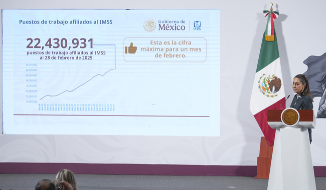 La Presidenta de México, Claudia Sheinbaum Pardo, destacó que al 28 de febrero se tiene un registro histórico de 22 millones 430 mil 931 puestos de trabajo afiliados ante el Instituto Mexicano del Seguro Social (IMSS).