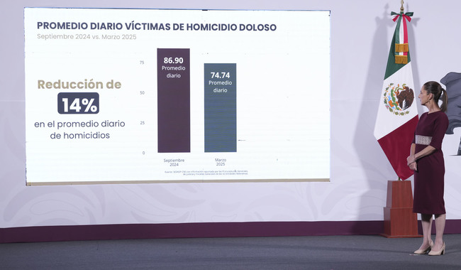 La Presidenta de México, Claudia Sheinbaum Pardo, resaltó que gracias a la Estrategia Nacional de Seguridad, en marzo de 2025 hay 12 homicidios diarios menos en el país que en septiembre de 2024.