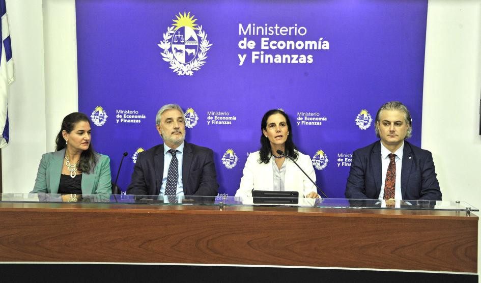 Arbleche explicó que obtener una mejor nota crediticia implica un menor costo de financiamiento para Uruguay, que registra un riesgo país de 78 puntos básicos de acuerdo al índice de JPMorgan, lo cual refleja un “hito histórico”, destacó, acompañada por el subsecretario, Alejandro Irastorza; y los directores de Política Económica, Marcela Bensión, y de la Unidad de Gestión de Deuda, Herman Kamil.