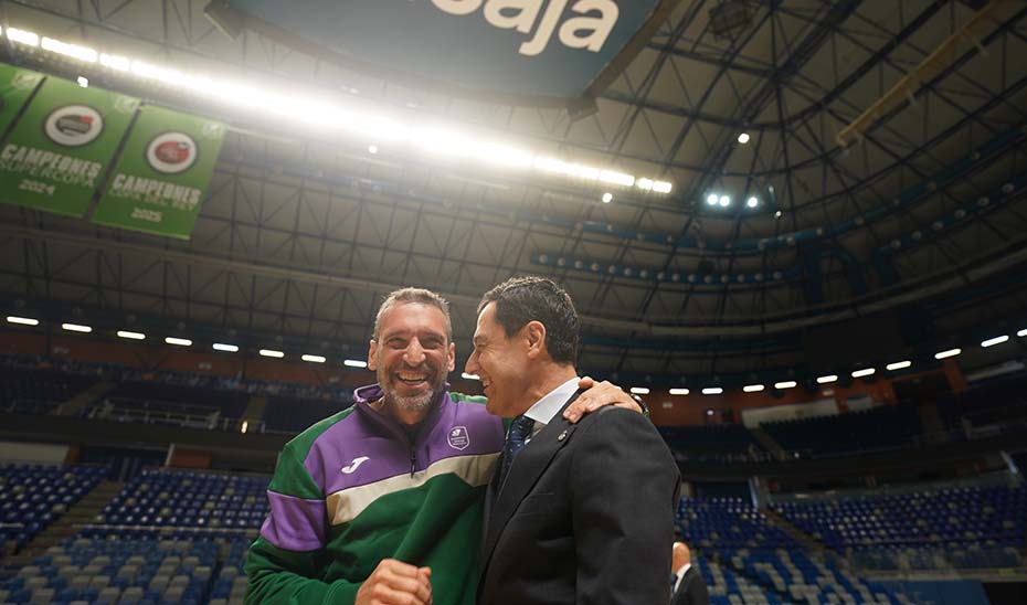 Juanma Moreno felicita al entrenador de Unicaja Baloncesto, ibon Navarro.