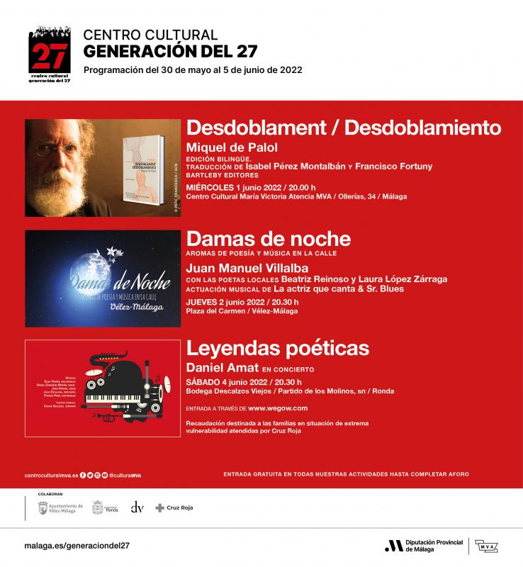 El Centro del 27 de la Diputación programa a partir de hoy actividades culturales tanto en la capital como en la provincia. Así, hoy 1 de junio, se presentará en el MVA el libro ‘Desdoblamiento / Desdoblament’ de Miquel de Palol, y en la provincia habrá dos encuentros musicales: el jueves 2, el poeta Juan Manuel Villalba protagonizará en Vélez-Málaga una nueva cita del ciclo ‘Damas de noche. Aromas de poesía y música en la calle’, y el sábado 4 de junio tendrá lugar en Ronda el concierto benéfico a favor de Cruz Roja ‘Leyendas poéticas’ con el pianista Daniel Amat y una formación de jazz.