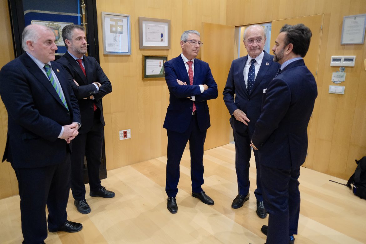 El alcalde de Málaga, Francisco de la Torre, acompañado por el concejal de Economía, Carlos Conde, y junto al junto al presidente de la Cámara de Cuentas de Andalucía, Manuel Alejandro Cardenete, y el presidente de la Diputación, Francisco Salado, ha asistido al pleno de la Cámara de Cuentas de Andalucía, que se ha desarrollado esta mañana en el Salón de los Pasos Perdidos de la Diputación. Previamente, el primer edil ha participado en la rueda de prensa ofrecida en el marco de un encuentro con alcaldes y secretarios de la provincia. sobre la rendición de cuentas de las entidades sociales. La comparecencia ha estado precedida por un encuentro con el presidente de la Cámara de Cuentas de Andalucía, Manuel Alejandro Cardente.
