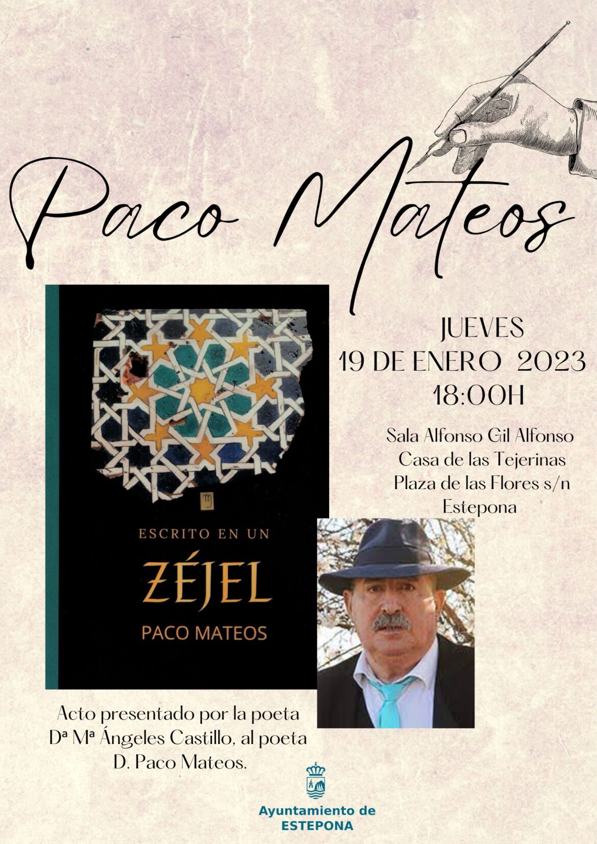 El Ayuntamiento de Estepona informa que el poeta, escritor y conferenciante Paco Mateos presentará el próximo jueves 19 de enero en la Sala Alfonso Gil Alfonso de la Casa de Las Tejerinas, su último libro, “Escrito en un Zéjel”. El acto tendrá lugar a las 18:00 horas, y estará presentado por la poeta Mª Ángeles Castillo.