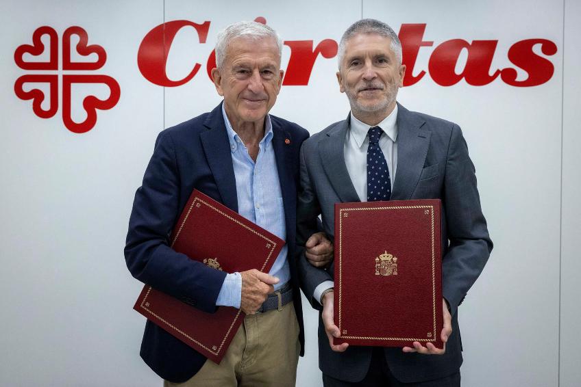 El ministro del Interior, Fernando Grande-Marlaska, y el presidente de Cáritas Española, Manuel Bretón, han suscrito el acuerdo, con una vigencia de cuatro años prorrogables, que prevé el desarrollo de proyectos conjuntos entre las dos instituciones