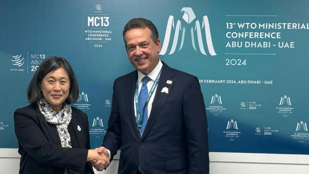 El ministro de Industria, Comercio y Mipymes, Víctor- Ito- Bisonó y la representante de Comercio de Estados Unidos (USTR), embajadora Katherine Tai, sostuvieron una reunión, en el marco de la 13° Conferencia Ministerial de la OMC, en la que pasaron revista a asuntos de interés bilateral, entre los que figuran los avances experimentados por el país en materia de defensa de los derechos de propiedad intelectual.