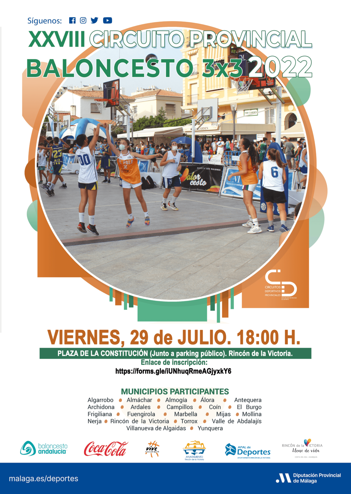 El APAL de Deportes del Ayuntamiento de Rincón de la Victoria ha anunciado la celebración del XXVIII Circuito Provincial de Baloncesto 3×3 de la Diputación que se celebrará el próximo 29 de julio en la Plaza de la Constitución.