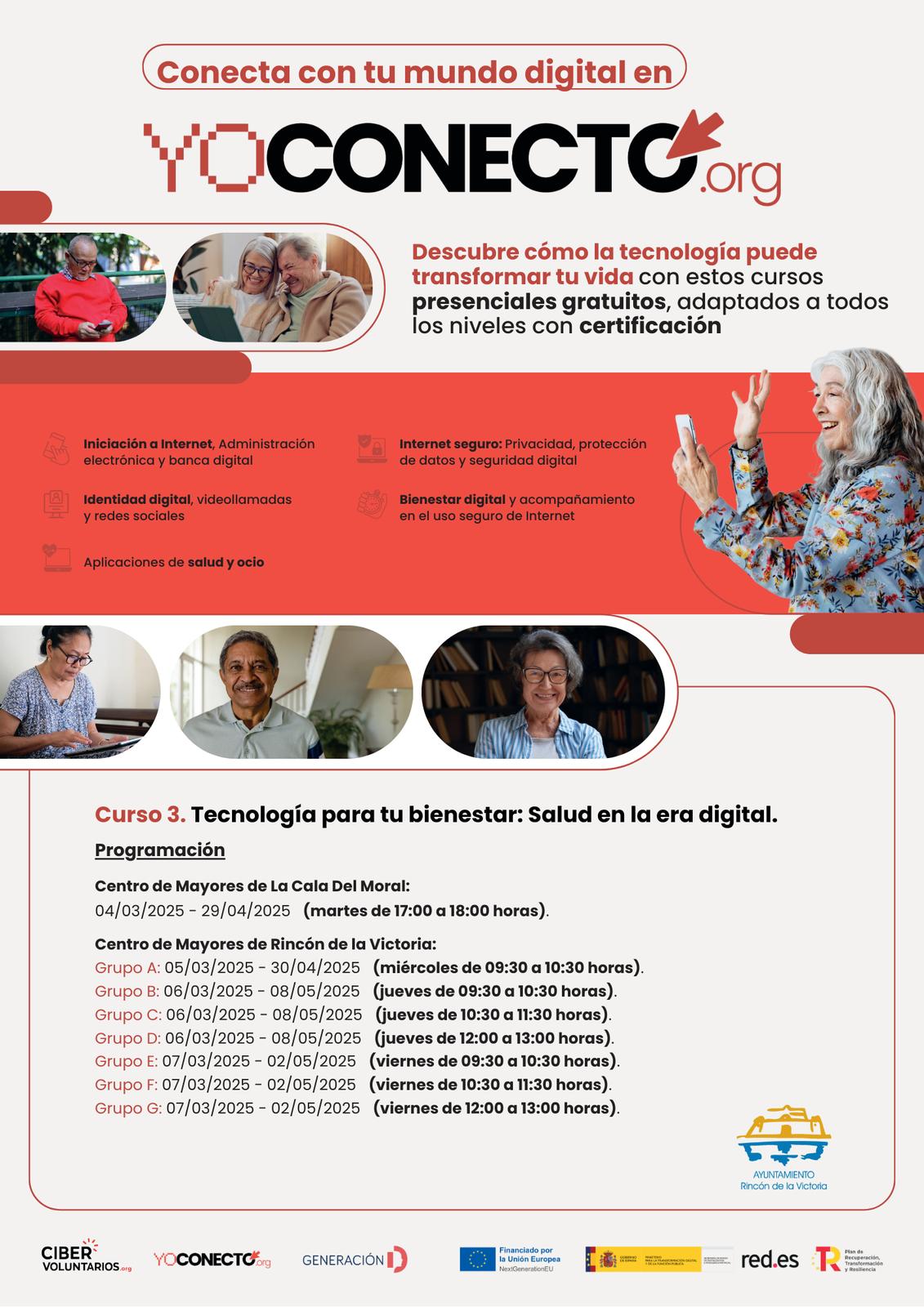 Se trata del curso `Tecnología para tu bienestar: Salud en la era digital´ del proyecto `Yo Conecto´ que será impartido por la Fundación Cibervoluntarios a partir del 4 de marzo en los Centros de Participación Activa de Mayores de Rincón de la Victoria y La Cala del Moral.