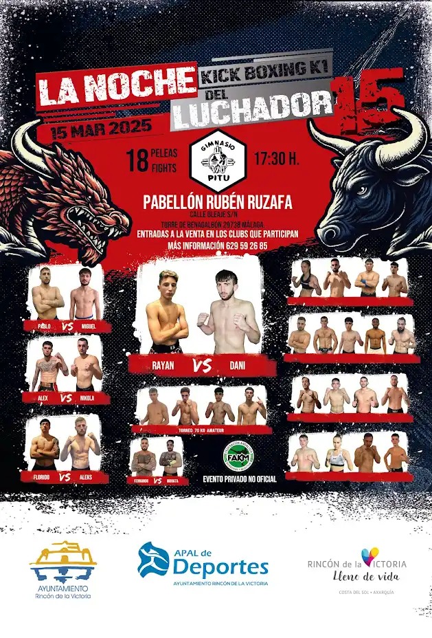 El Pabellón Rubén Ruzafa de Torre de Benagalbón acogerá el próximo sábado 15 de marzo la XV edición de La Noche del Luchador en la que entrarán en liza hasta 36 luchadores en otros 18 combates de Kick Boxing y K1.