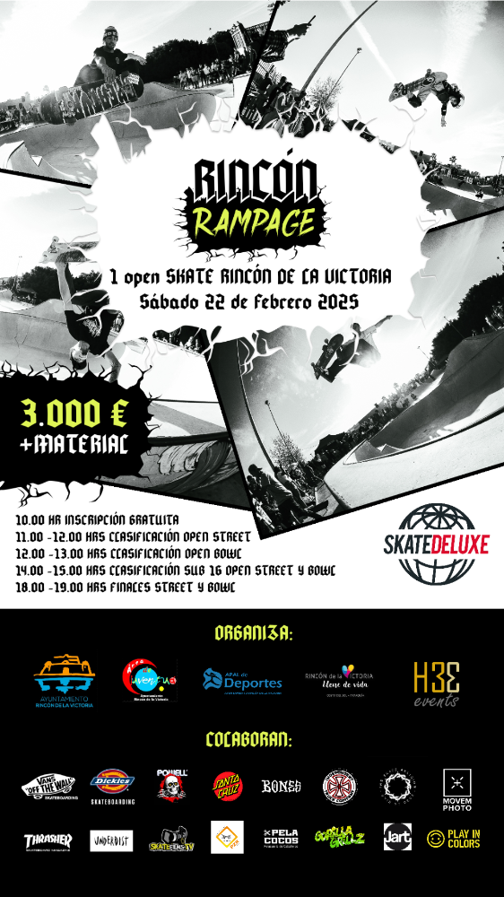 Hasta 3.000 euros en metálico y otros 500 euros más en material deportivo estarán en juego el próximo sábado 22 de febrero de 2025 en la primera edición del Open Internacional de Skate `Rincón Rampage´ que organiza el área de Juventud del Ayuntamiento de Rincón de la Victoria y que promueve H3 Events.