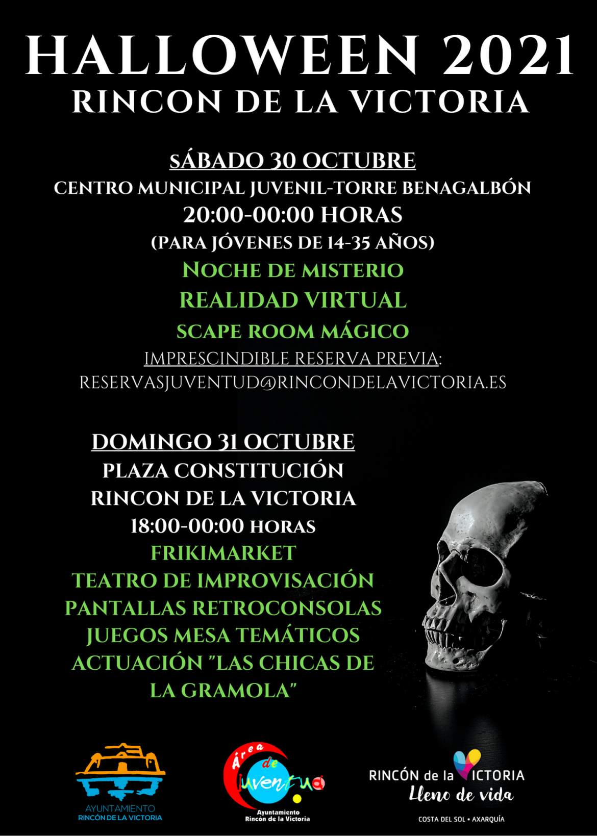 Se celebrarán actividades durante los días 30 y 31 de octubre en el Centro Municipal Juvenil en Torre de Benagalbón, y la Plaza de la Constitución de la localidad. Scape room, realidad virtual, noche de misterio, teatro, música, juegos temáticos, etc., gratuitos organizados por el área.