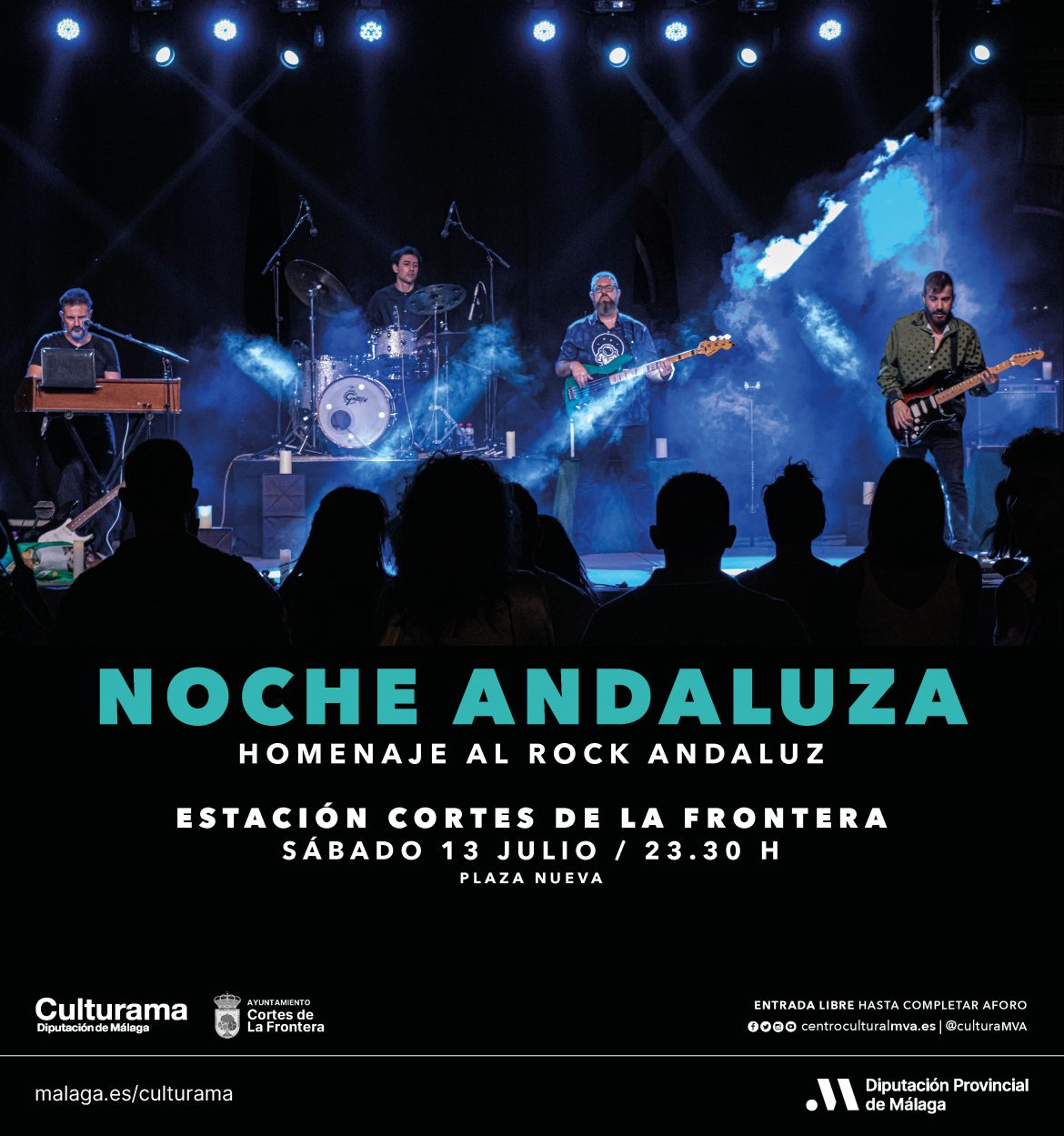 La Plaza Nueva de Estación de Cortes de la Frontera acoge el próximo sábado 13 de julio, a partir de las 23.30 horas, el espectáculo ‘Noche Andaluza’. Un homenaje al rock andaluz, donde se repasan las canciones más representativas del movimiento desde finales de los años 70 y primeros 80, recordando a grupos y artistas como Triana, Alameda, Medina Azahara, Camarón o Lole y Manuel entre otros. Se trata de un concierto dinámico, lleno de emociones y con un claro carácter cultural y divulgativo. La entrada es libre hasta completar aforo.